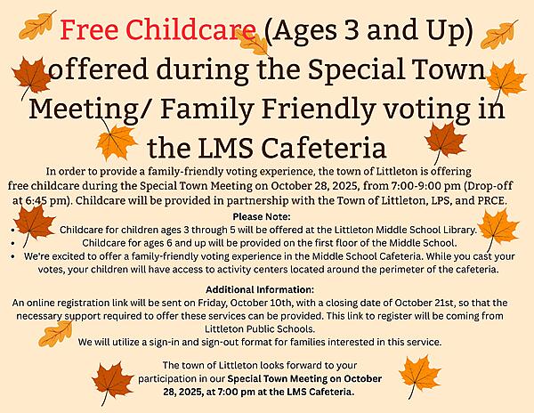 Free Childcare (Ages 3 and Up) offered during the Special Town Meeting