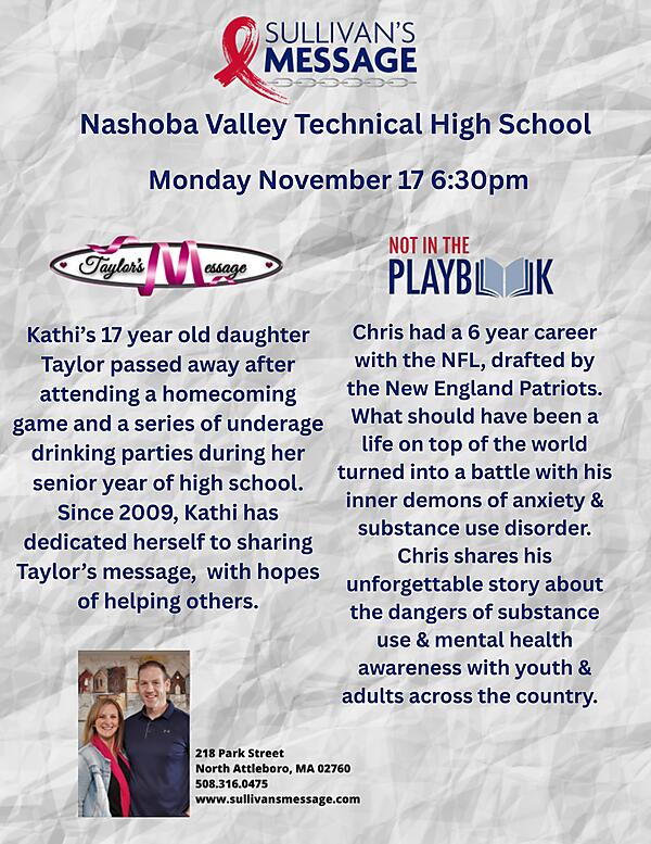 On Monday, November 17th, Nashoba Tech would like to extend an invitation to the Littleton Community to attend. The event features Chris and Kathi Sullivan of "Sullivan's Message," who will share their deeply personal and impactful stories concerning the opioid epidemic and mental health awareness. Kathi Sullivan shares the story of her daughter, Taylor, who passed away at 17, and her dedication to raising awareness about the tragic consequences of substance use and underage drinking. Chris Sullivan, a former New England Patriot, speaks candidly about his own battle with anxiety and substance use disorder, providing a crucial message on mental health and the dangers of addiction. The attached flyer contains all the specific details. We believe this is a vital message for every family in our region, and we would be grateful if you could share this information with your community.