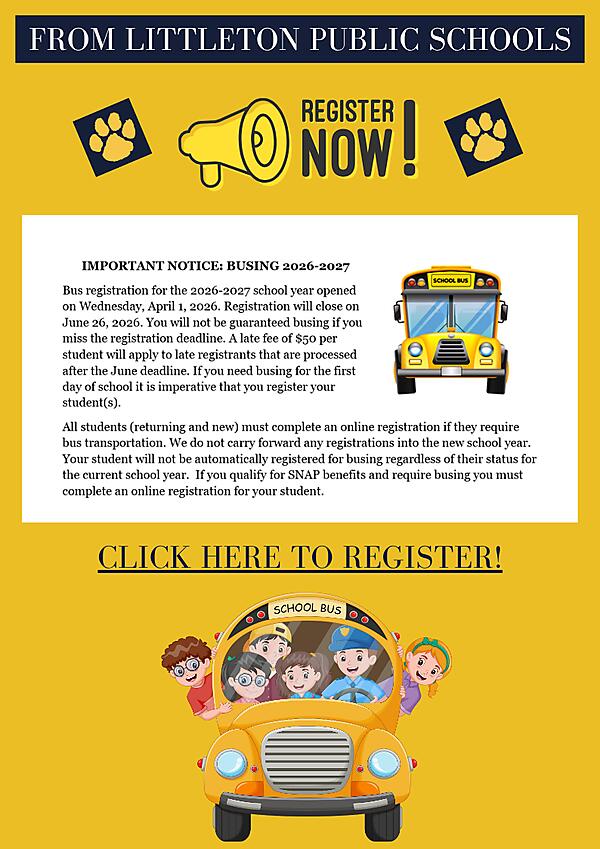 Bus registration for the 2026–2027 school year opened on Wednesday, April 1, 2026. Registration will close on June 26, 2026. You will not be guaranteed busing if you miss the registration deadline. A late fee of $50 per student will apply to late registrants that are processed after the June deadline. If you need busing for the first day of school, it is imperative that you register your student(s).